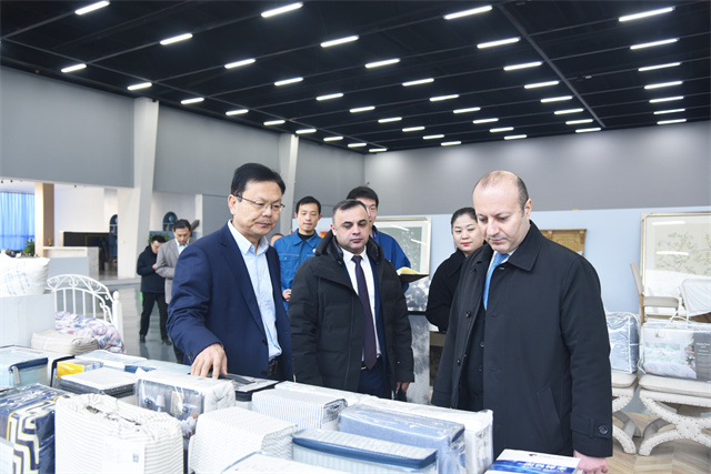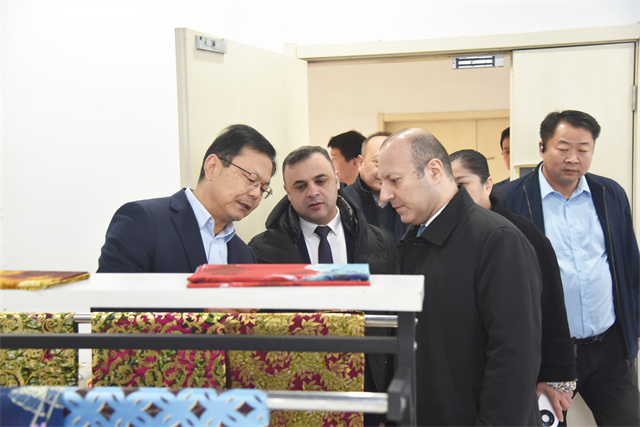 特穆爾·納迪羅格魯公使一行參觀了公司智云中心、檢測中心、綜合辦公區(qū)、服裝面料公司、花布公司、家紡公司、創(chuàng)意中心、研究院、花布車間、面料車間、家紡車間、家紡成品車間、服裝車間等區(qū)域,高度贊賞了公司在科技創(chuàng)新、環(huán)保實踐、產(chǎn)品多元化、產(chǎn)業(yè)布局等方面的成就。